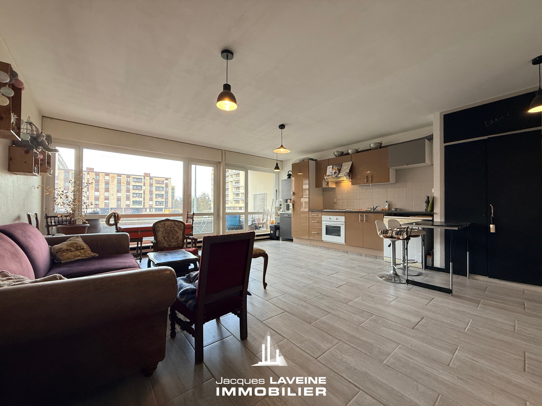 EXCLUSIVITÉ JLI! Metz-centre ville, quartier du Pontiffroy, dans résidence avec ascenseur, vaste appartement 2 pièces de 57m², il comprend une entrée avec placards, vaste espace séjour-cuisine aménagée de 29m² accès loggia, un dégagement nuit avec placards, une chambre de + de 16m² accès loggia, salle de bains-wc. Cave et emplacement de parking souterrain privatif. libre à la vente!